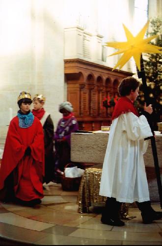 star, and we have come to pay him homage." King Herod was greatly perturbed when he heard this; and so was the whole of Jerusalem. He called a meeting of the chief priests and lawyers of the Jewish people, and put before them the question: "Where is it that the Messiah is to be born?" "At Bethlehem in Judaea," they replied; and they referred him to the prophecy which reads: "Bethlehem in the land of Judaea, you are far from least in the eyes of the rulers of Judah; for out of you shall come a leader to be the shepherd of my people Israel." ( siehe Micha 5,1) Herod next called the astrologers to meet him in private, and ascertained from them the time when the star had appeared. He then sent them on to Bethlehem and said, "Go and make a careful inquiry for the child. When you have found him, report to me, so that I may go myself and pay him homage." They set out at the king's bidding; and the star which they had seen at his rising went ahead of them until it stopped above the place where the child lay. At the sight of the star they were overjoyed. Entering the house they say the child with Mary his mother and bowed to the ground in homage to him; then they opened their treasures and offered him gifts: gold, frankincense, and myrrh. And being warned in a dream not to go back to Herod, they returned home another way. (Matthew 2, 1 - 12) |